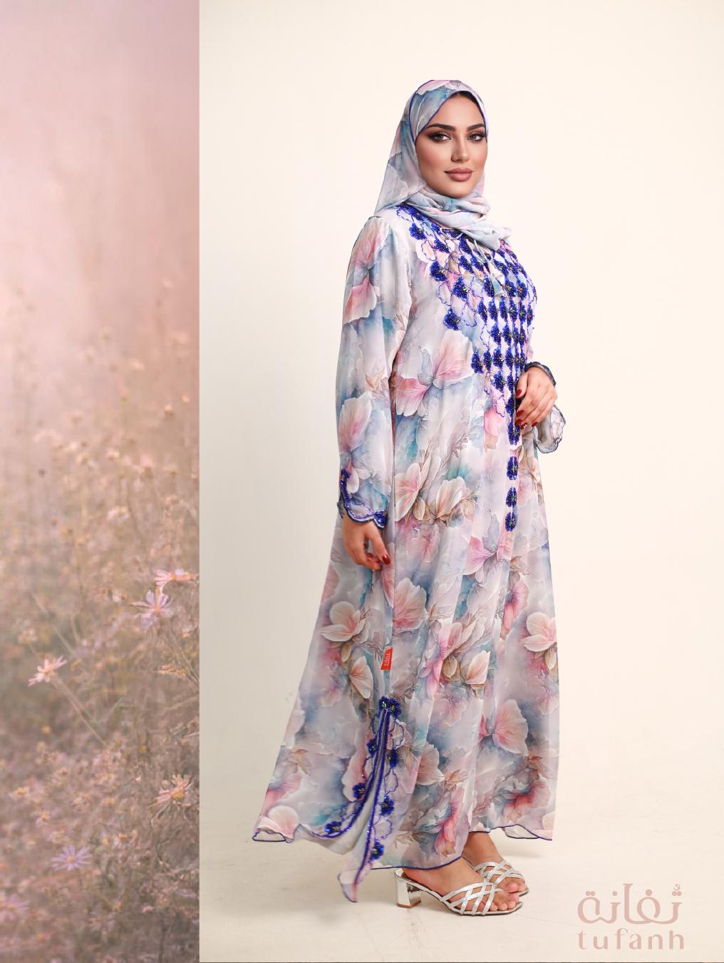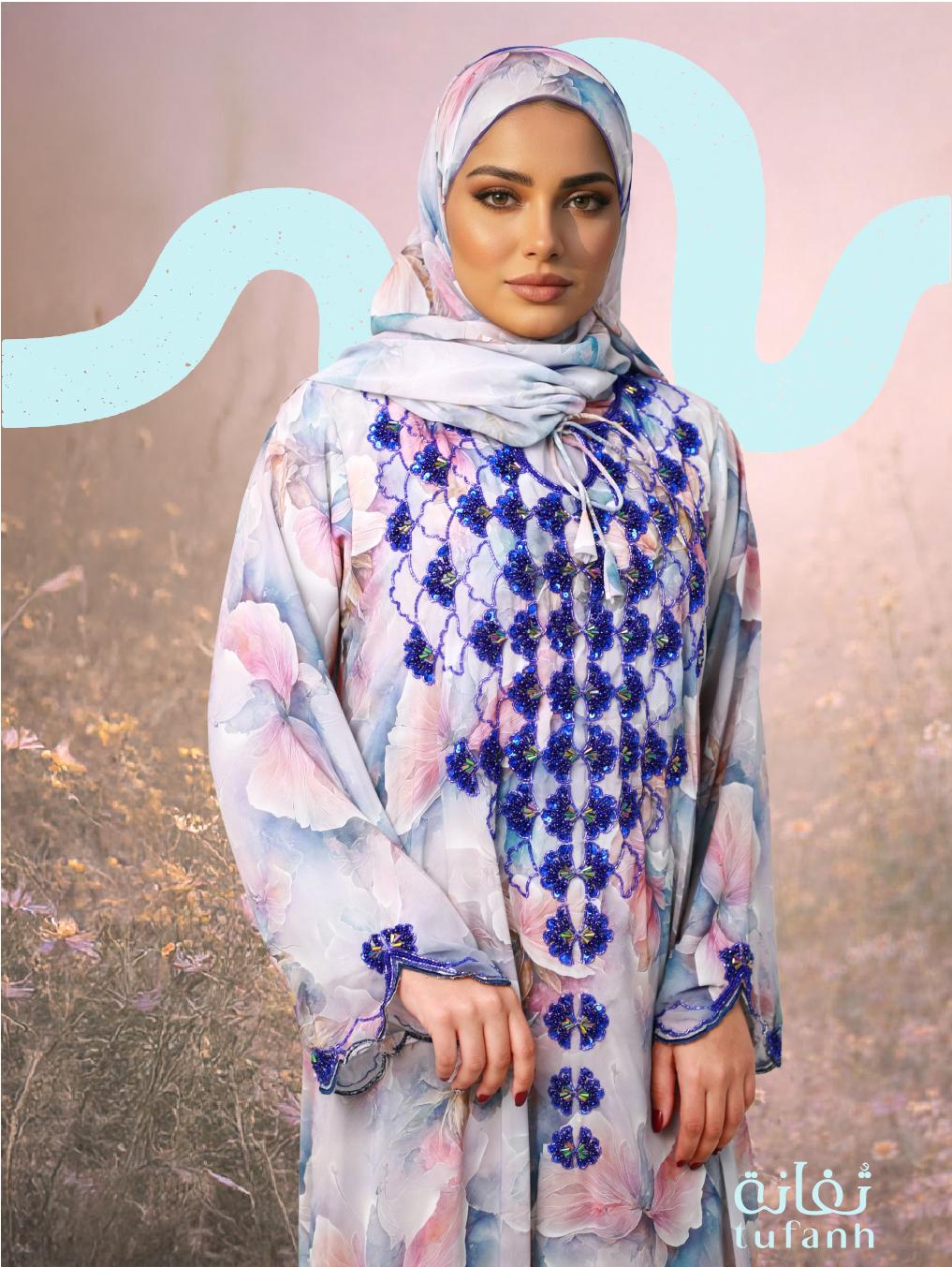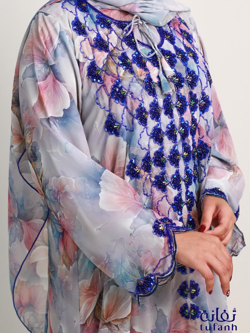 تصميم شيفون باللون الأزرق يعكس هدوء اللون وعمقه، مبطن بقماش كريب خفيف يوفّر راحة وثباتًا في اللبس مع انسيابية ناعمة. يتزيّن بالشكّ الأزرق المنفّذ بدقّة ليضفي فخامة هادئة على التصميم، مع تفاصيل شكّ على الأكمام وفتحات جانبية مزدانة بالخرز والفولك تعزّز جمال الحركة وتوازن القصّة. يأتي مع شيلة عريضة متناسقة تكمل الإطلالة بذوق راقٍ، ليكون خيارًا أنيقًا للمناسبات والطلعات الخاصة.